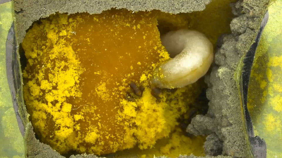 Film bez dźwięku. Pojawia się film ukazujący rozwój jajeczka. Widać na nim małą, podłużną larwę, która zjada pyłek. Dzięki pokarmowi larwa rośnie i zmienia kolor. Jej powłoka staje się grubsza. Larwa wydala kał. Jest on brązowy i podłużny. Po upływie czasu w komórce pojawia się oprzęd, który przypomina kokon.