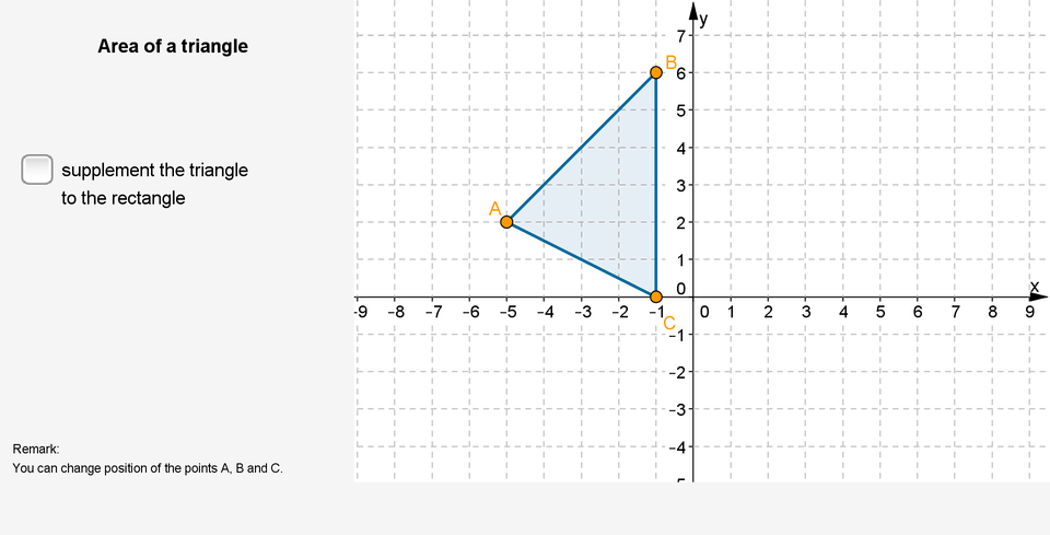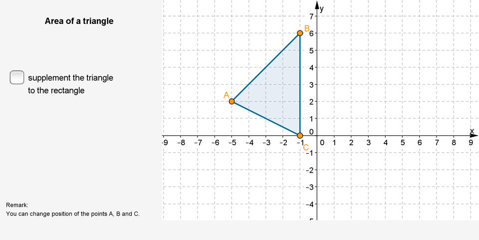 Open Geogebra applet: „Area of a triangletriangletriangle in the coordinate systemcoordinate systemcoordinate system”.