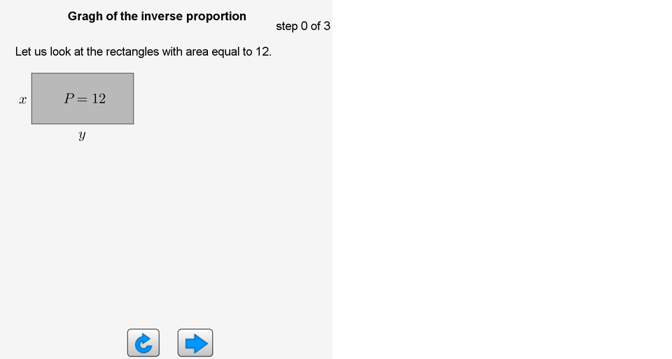 Po lewej stronie rysunku znajduje się tekst: Graph of the inverse proportion. Let us look at the rectangles with area equal dwanaście. Poniżej tekstu narysowany jest prostokąt, którego dłuższy bok (poziomy) oznaczony jest literą y, a krótszy bok (pionowy) oznaczony jest literą x. Wewnątrz prostokąta jest zapis (wielką literą) P równa się dwanaście. Poniżej zapis: If jeżeli x równa się dwanaście, then y równa się jeden. Niżej tekst Place each of those rectangles on the plane. Rectangle's vertex has coordinates A równa się, nawias zwykły, w nawiasie, dwanaście, przecinek, ułamek zwykły, w liczniku dwanaście, w mianowniku dwanaście, równa się, nawias zwykły, w nawiasie, dwanaście, przecinek, jeden. Po prawej stronie rysunku znajduje się układ współrzędnych. Oś poziomą oznaczono małą literą x i zaznaczono liczby od zera do dwunastu. Oś pionową oznaczono małą literą y i zaznaczono liczby od zera do dwunastu. W tak dobranym układzie współrzędnych narysowano prostokąty w ten sposób, że bok y leży na osi y, a bok x na osi x, lewy dolny wierzchołek każdego z prostokątów leży w początku układu współrzędnych. Pierwszy prostokąt x równe dwa, y równe dwanaście drugich, czyli sześć. Drugi prostokąt x równe trzy, y równe dwanaście trzecich, czyli cztery. Trzeci prostokąt x równe cztery, y równe dwanaście czwartych, czyli trzy. Czwarty prostokąt x równe pięć, y równe dwanaście piątych dwa i dwie piąte. Piąty prostokąt x równe sześć, y równe dwanaście szóstych, czyli dwa. Szósty prostokąt x równe siedem, y równe dwa i cztery dziesiąte. Siódmy prostokąt x równe osiem, y równe dwanaście siódmych, czyli w przybliżeniu jeden i siedemdziesiąt jeden setnych. Ósmy prostokąt x równe dziewięć, y równe dwanaście dziewiątych, czyli jeden i jedna trzecia. Dziewiąty prostokąt x równe dziesięć, y równe dwanaście dziesiątych, czyli jeden i jedna piąta. Dziesiąty prostokąt x równe jedenaście, y równe dwanaście jedenastych, czyli w przybliżeniu jeden i dziewięć setnych. Jedenasty prostokąt x równe dwanaście, y równe dwanaście dwunastych, czyli jeden. Przez wierzchołki prostokątów, które nie leżą na osiach układu współrzędnych (prawe, górne), można poprowadzić linię będącą wykresem proporcjonalności odwrotnej.