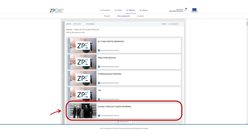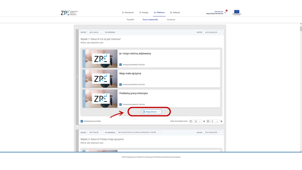 Do każdego wątku swojego e‑podręcznika możesz dodać nowy moduł. Aby to zrobić, kliknij przycisk Dodaj element na dole wątku i wybierz Materiał.