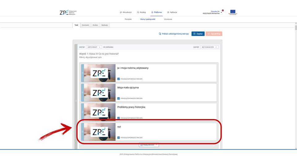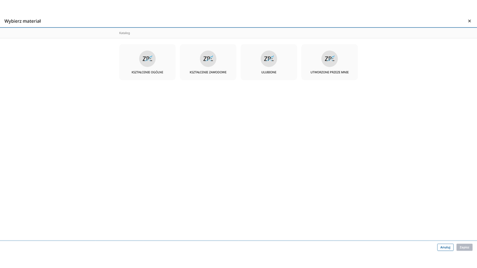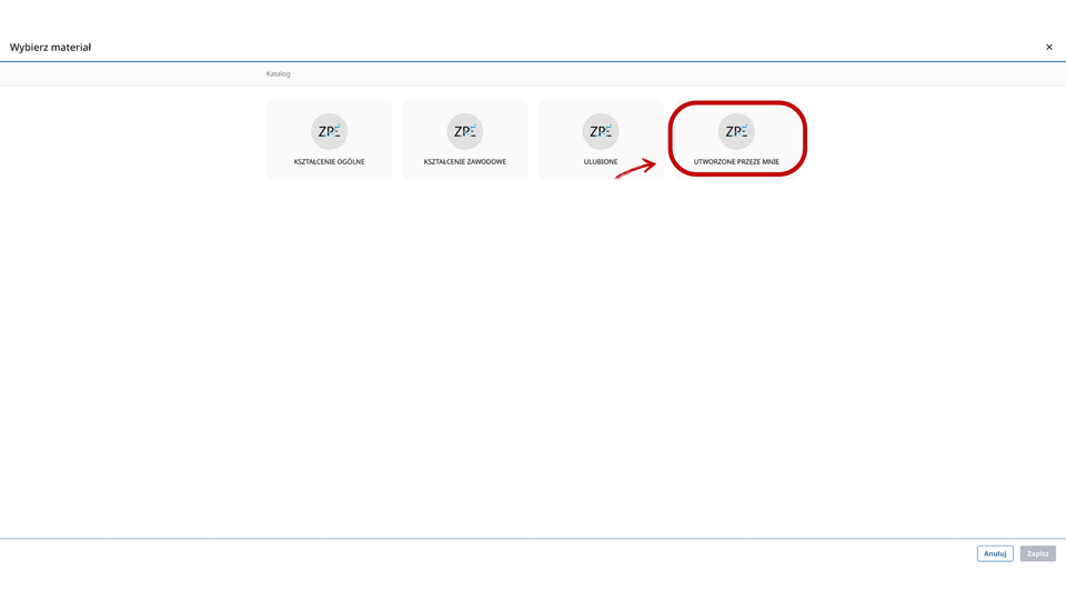 Zostaniesz przeniesiony na stronę, na której będziesz mógł wybrać czy chcesz dodać stworzony przez siebie materiał, czy materiał dostępny na ZPE.