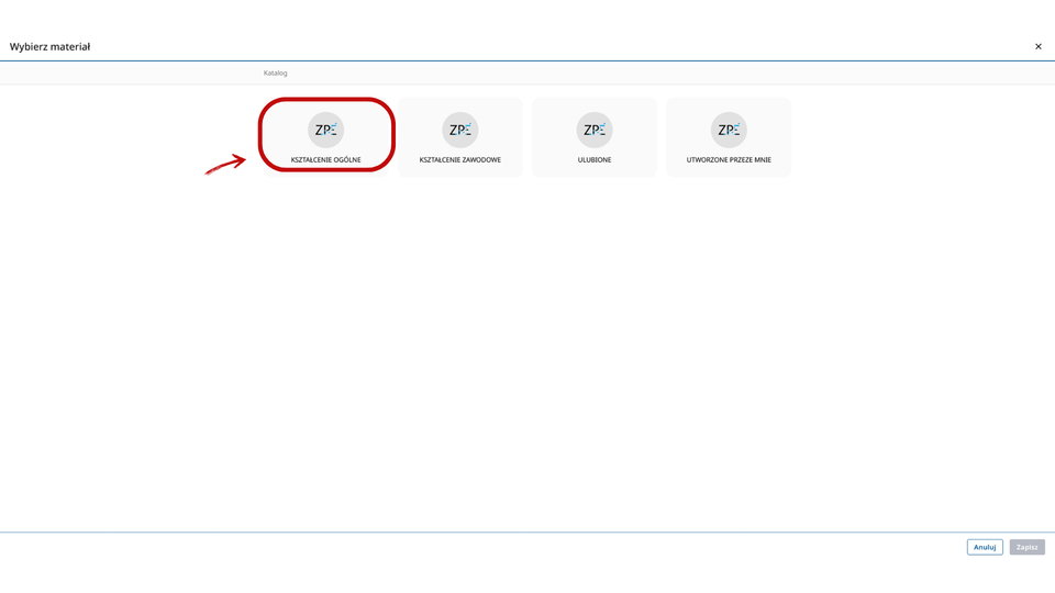 Jeśli chcesz dodać jeden z gotowych e‑materiałów dostępnych na ZPE, po kliknięciu Dodaj Element i przeniesieniu na stronę wyboru materiałów, kliknij Kształcenie ogólne.