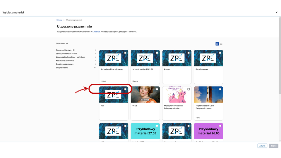 Zostaniesz przeniesiony do zakładki ze wszystkimi utworzonymi przez Ciebie wcześniej materiałami. Wybierz ten, który chcesz dodać jako moduł do swojego e‑podręcznika. Kliknij w check box przy wybranym przez Ciebie materiale.