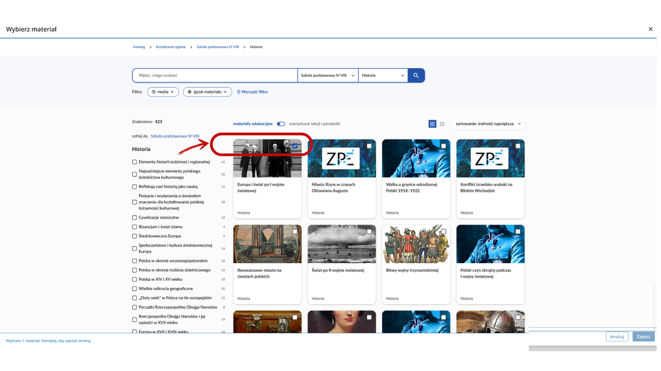 Zostaniesz przeniesiony do strony ze wszystkimi materiałami do kształcenia ogólnego. Możesz skorzystać z wyszukiwarki lub wybrać interesujący Cię etap edukacyjny, a następnie przedmiot. Konkretny materiał dodajesz poprzez kliknięcie check boxa przy wybranym przez ciebie materiale.