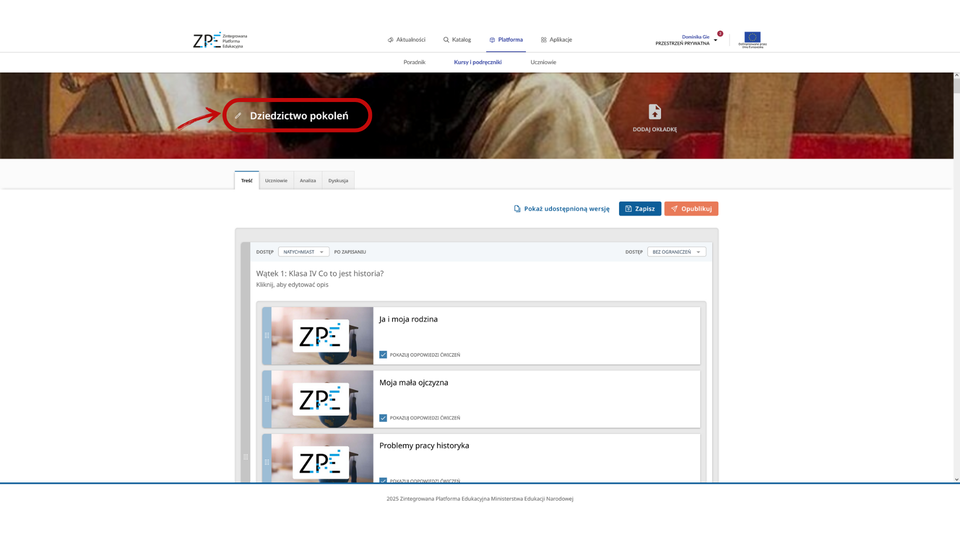 Teraz możesz go dowolnie modyfikować, tak żeby jak najlepiej dostosować go do potrzeb swoich i swoich uczniów. Możesz zacząć od zmiany tytułu modułowego e‑podręcznika. Aby to zrobić, kliknij na jego tytuł i wprowadź własny.