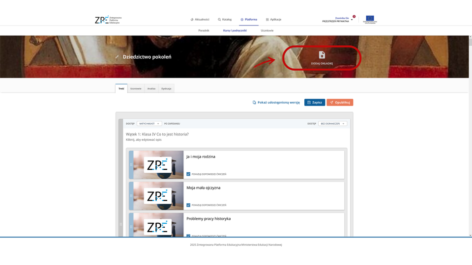 Możesz też zmienić okładkę podręcznika, klikając na przycisk Dodaj okładkę i wybierając dowolną grafikę ze swojego komputera.