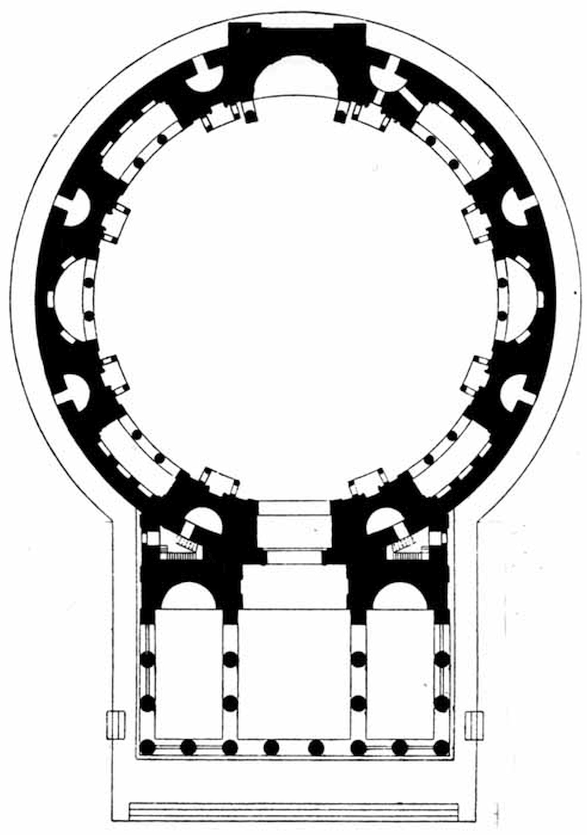 Cyframi zostały oznaczone następujące elementy (obejście z arkadami, narteks, prezbiterium, apsyda, nawa środkowa na planie ośmioboku, wieża z klatką schodową, półokrągłe nisze):