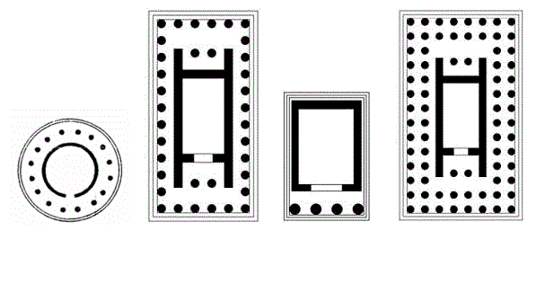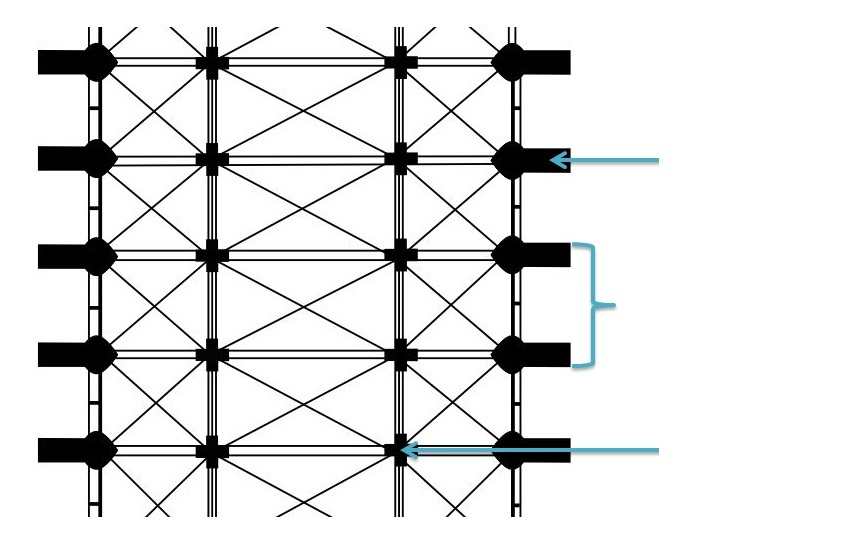 Ilustracja przedstawia czarno-biały schemat fragmentu planu kościoła, na którym, za pomocną odnośników, zostały oznaczone przypory znajdujące się na zewnątrz budowli oraz filary międzynawowe podtrzymujące arkadowe łuki pomiędzy nawami.