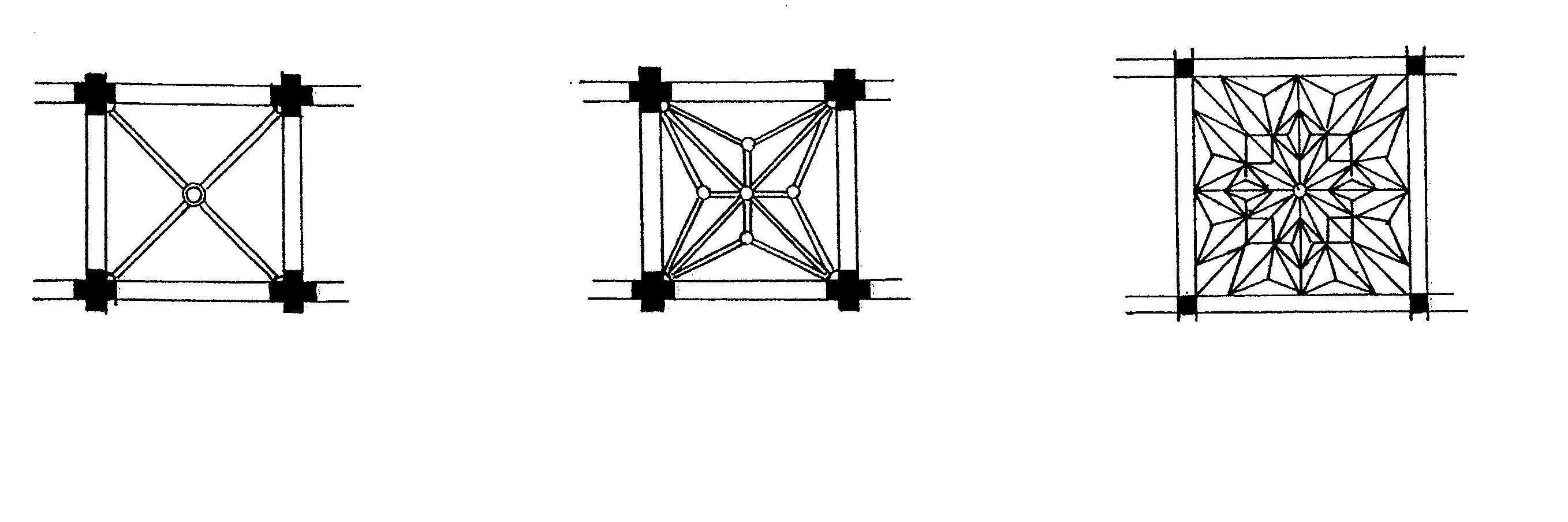 Rzuty poziome sklepień gotyckich: a) krzyżowo-żebrowe, b) gwiaździste, c) kryształowe, d) sieciowe, na podstawie W. Bogusz, Zarys historii architektury, WSiP, 1996 s. 70, CC BY 3.0
