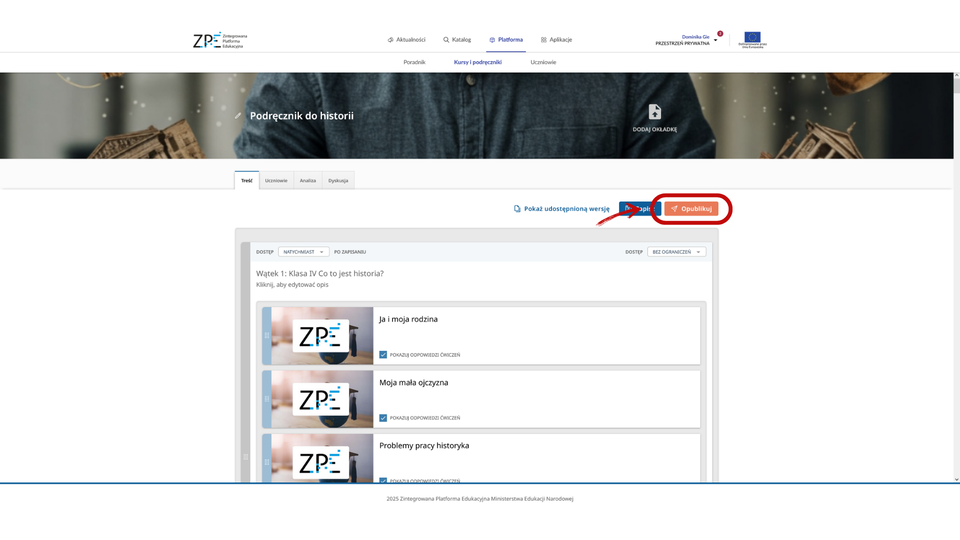 Jeśli chcesz udostępnić swój modułowy e‑podręcznik uczniom wejdź w modułowy e‑podręcznik, który chcesz udostępnić i kliknij Opublikuj.