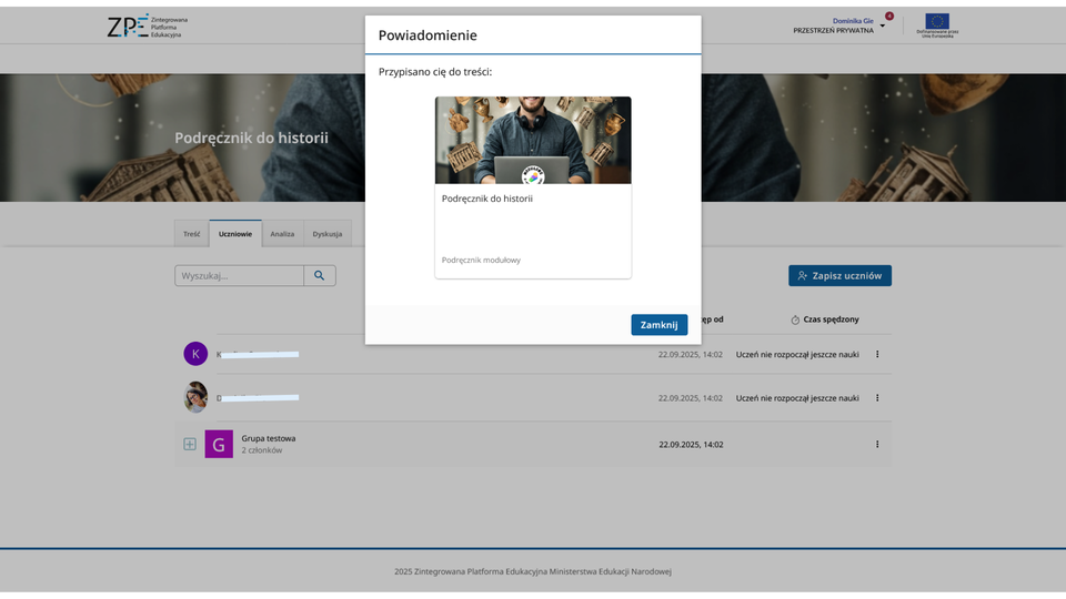 Uczniowie otrzymują na swoich profilach ZPE oraz mailowo informację, że zostali przypisani do danego e‑podręcznika. Co znaczy, że mogą rozpocząć w nim pracę.