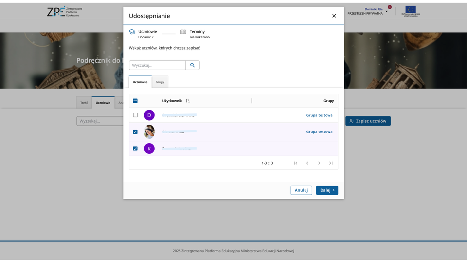 Pojawi się okno Udostępnianie, w którym możesz wybrać pojedynczych uczniów lub grupy, którym chcesz ten e‑podręcznik udostępnić.
