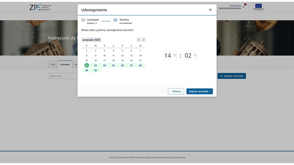 Kiedy wybierzesz już uczniów lub grupy, kliknij Dalej. Zostaniesz przeniesiony do kalendarza, w którym możesz zaznaczyć, od kiedy uczniowie mogą korzystać z modułowego e‑podręcznika. Może to być data i godzina bieżąca lub przyszła.