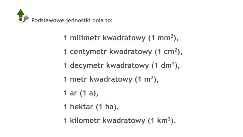 Podstawowe jednostki pola to kwadraty o bokach długości: , , , , , , .