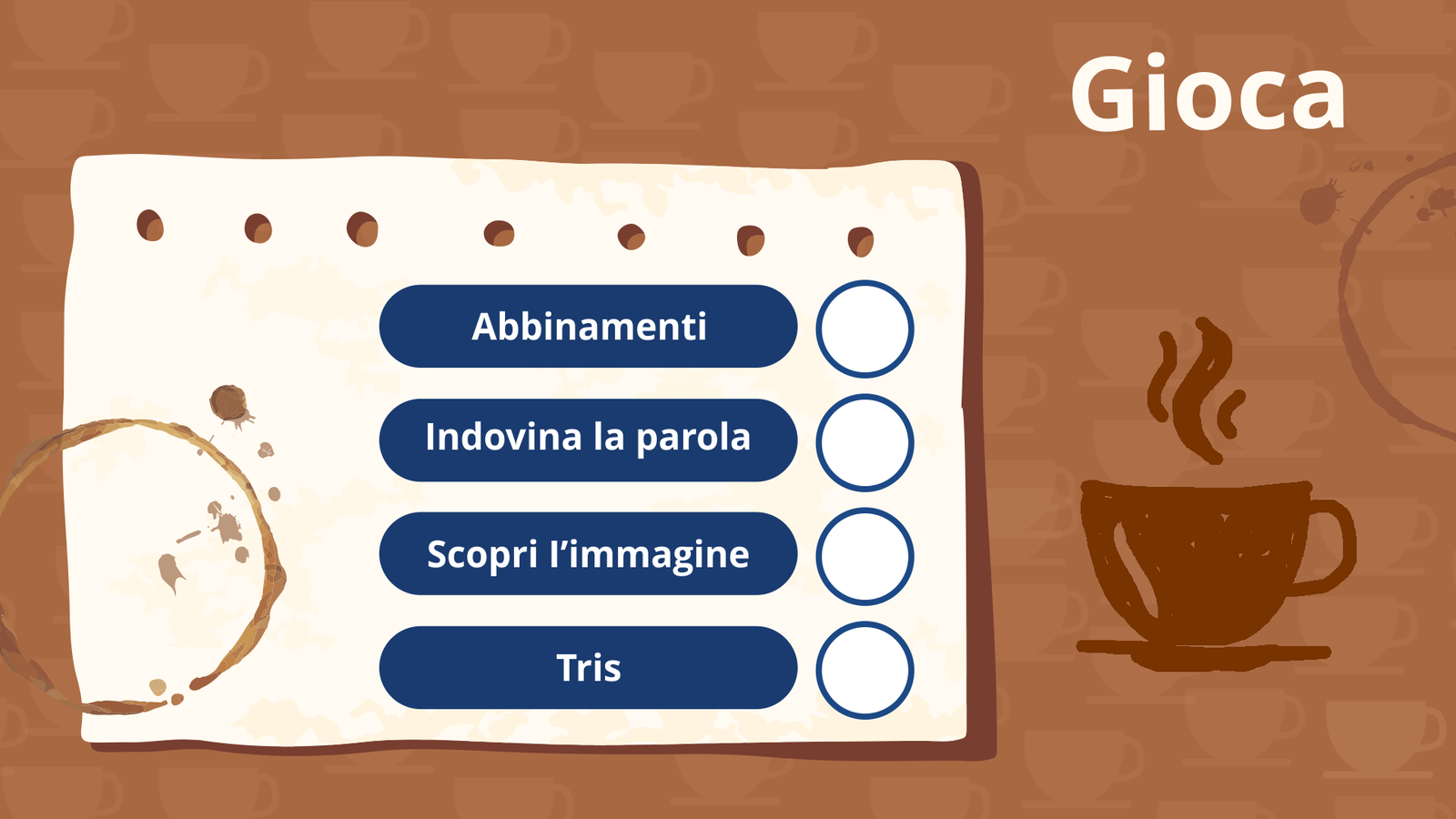 Completa quattro giochi diversi per conoscere meglio e ripetere il lessico utile in un bar italiano.