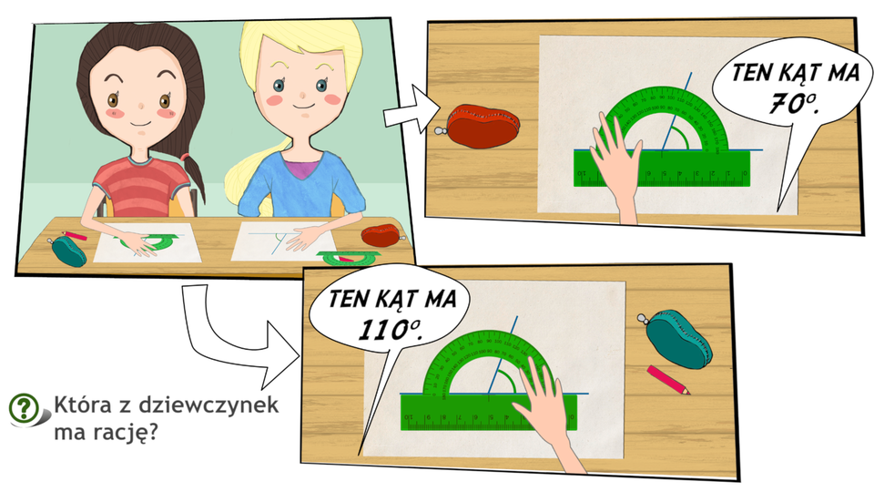Lena i Milena miały zmierzyć za pomocą kątomierza narysowany kąt.