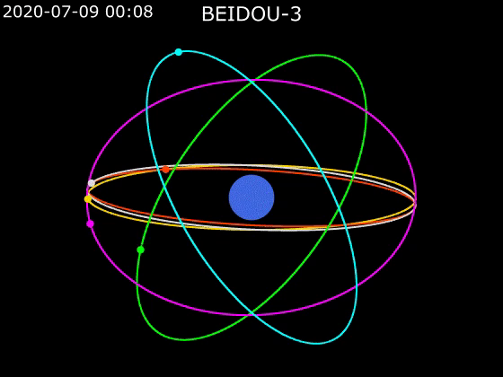 Animacja przedstawia orbity satelitów systemu BEIDOU‑3. W jej centrum znajduje się koło obrazujące Ziemię. Dookoła znajduje się sześć eliptycznych okręgów przedstawionych w różnych kolorach. Po ich obwodach poruszają się punkty. W lewym górnym rogu znajduje się data 2020‑07‑09 oraz odliczany czas od 00:00 do 24:00. Z upływem czasu punkty znajdujące się na elipsach poruszają się . Powyżej opis BEIDOU‑3.