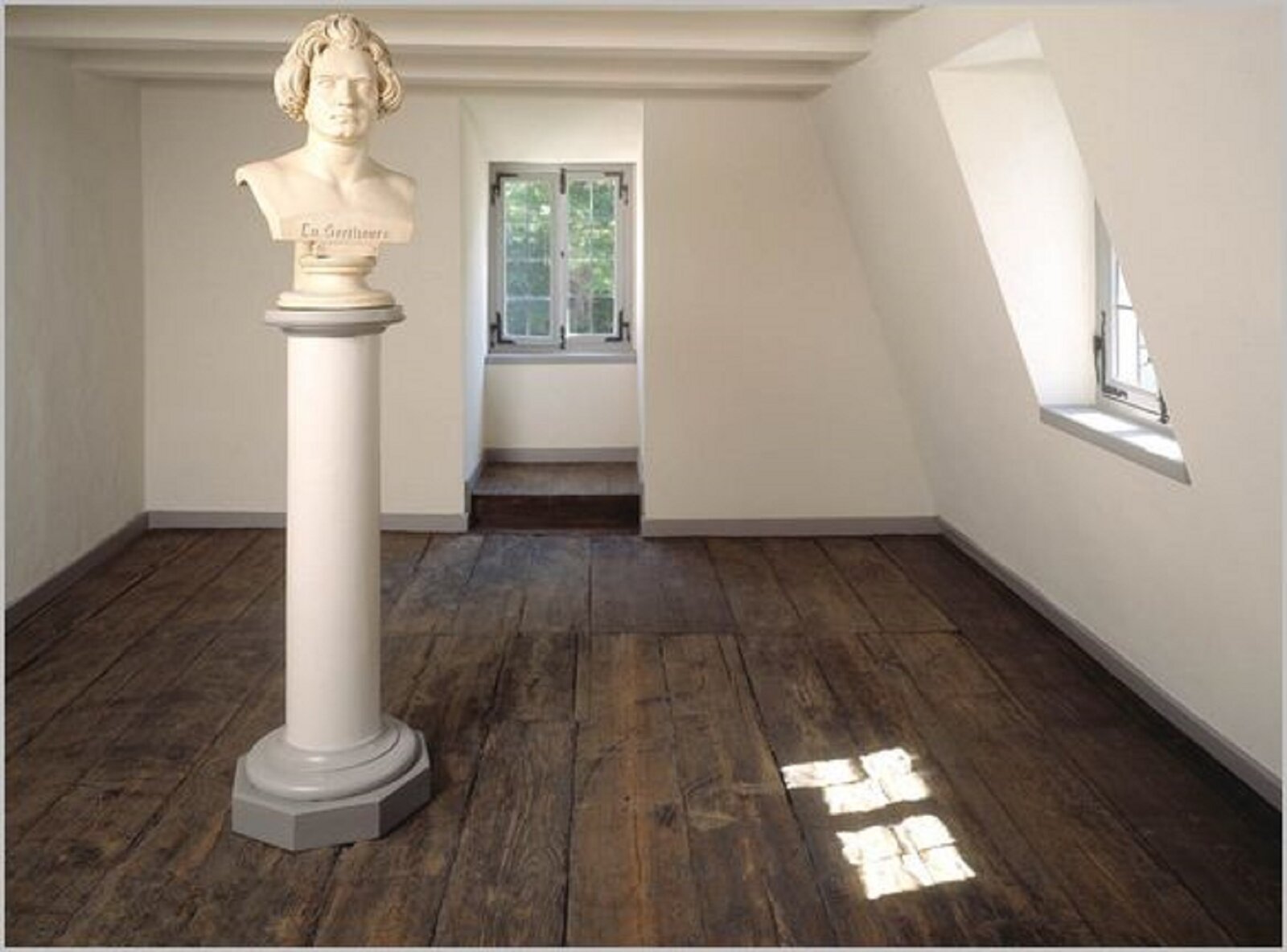Ilustracja interaktywna przedstawia izbę w domu rodzinnym Beethovena w Bonn. Ciemnobrązowa podłoga, kremowe ściany. Na każdej ze ścian małe okno. Dodatkowo na ilustracji umieszczono następujące informacje: 1. Z rodzinnym miastem Bonn wiąże się okres dzieciństwa młodego Ludwiga – pierwsze lekcje muzyki pobierane u ojca i zaprzyjaźnionych muzyków, następnie regularna nauka rzemiosła kompozytorskiego u Ch. G. Neefego, a także trudny czas, gdy po śmierci matki w 1787 roku młodzieniec sam musiał zadbać o utrzymanie rodzeństwa.