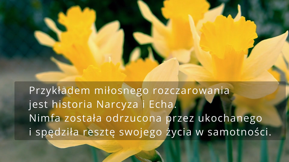 Film przedstawia żółte narcyzy, które ruszają się po wpływem powiewu wiatru. Na filmie pojawia się tekst: “Przykładem miłosnego rozczarowania jest historia Narcyza i Echa. Nimfa została odrzucona przez ukochanego i spędziła resztę swojego życia w samotności”.