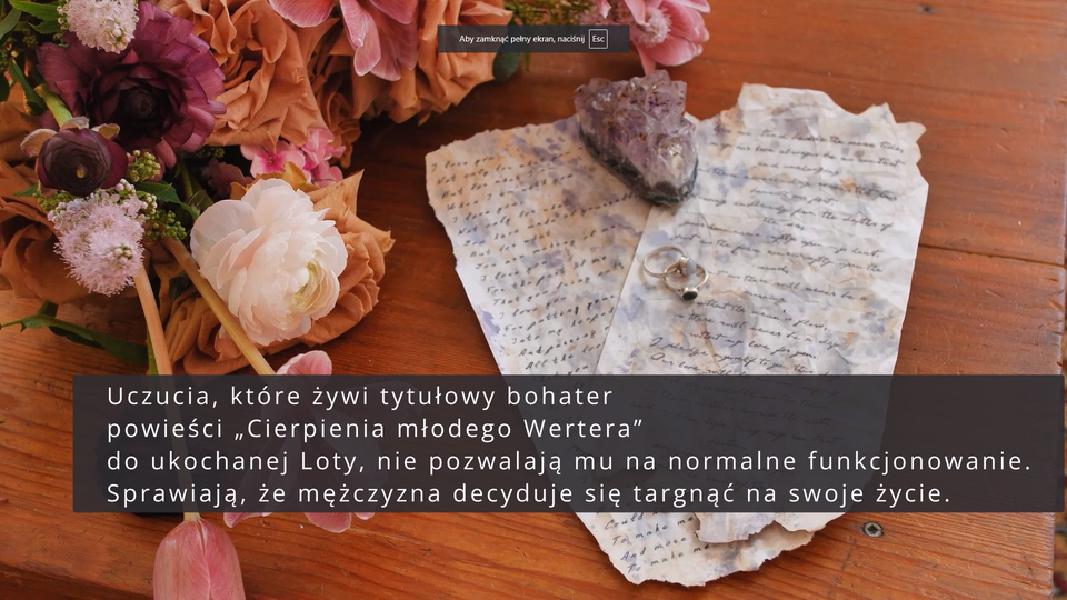Film przedstawia dwie kartki papieru postrzępione na końcach. Są one zapisane czarnym, ozdobnym pismem. Na kartkach leżą dwa pierścionki oraz fioletowy kamień. Z lewej strony widoczny jest bukiet kwiatów złożony z pomarańczowych, białych, różowych oraz fioletowych kwiatów. Na ekranie pojawia się tekst: “Uczucia, które żywi tytułowy bohater powieści „Cierpienia młodego Wertera” do ukochanej Loty nie pozwalają mu na normalne funkcjonowanie i sprawiają, że mężczyzna zdecydował się targnąć na swoje życie”.