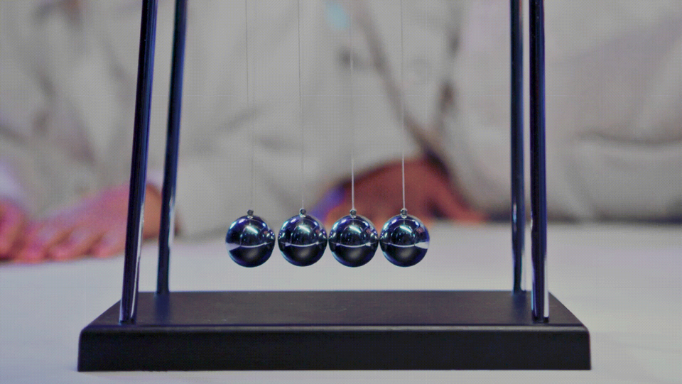 Jedna spadająca kula daje wystarczająco dużo energii, aby przemieścić drugą kulę na tę samą odległość, na którą spadła, z taką samą prędkością, z jaką spadła. Podobnie, dwie kule dają wystarczającą ilość energii, aby poruszyć dwie kule i tak dalej. Ale dlaczego kula po prostu nie odbije się tak, jak przyleciała? Dlaczego ruch jest kontynuowany tylko w jednym kierunku? W tym momencie w grę wchodzi zasada zachowania pęduzasada zachowania pędu.