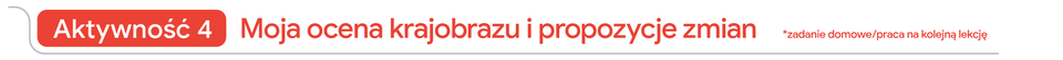 „Korzystając z Google Earth, odszukajcie swoje miejsce zamieszkania i jego najbliższe otoczenie. Dokonajcie oceny krajobrazu pod względem jego piękna oraz ładu i estetyki zagospodarowania terenu. Zastanówcie się, co wam się podoba, a co nie. Spróbujcie zaproponować jedną lub dwie zmiany w zagospodarowaniu terenu, które poprawiłyby jego estetykę lub funkcjonalność. Możecie zapisać swoje pomysły lub, jeśli macie taką możliwość, spróbować zaznaczyć je w Google Earth.”