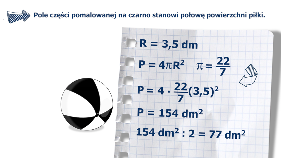 Animacja przedstawia rozwiązanie pewnego zadania, w którym wykorzystywany jest wzór na pole powierzchni całkowitej kuli.