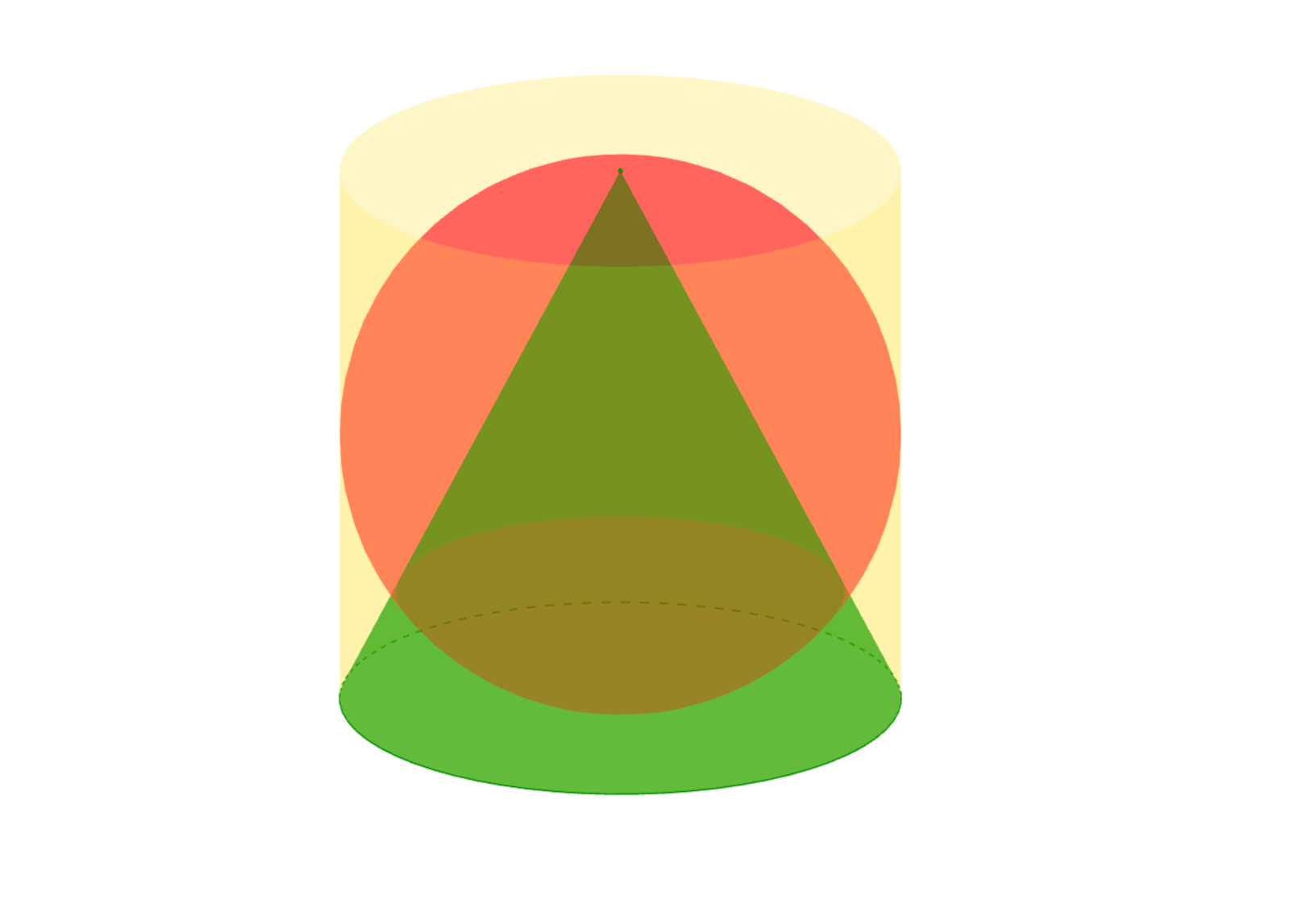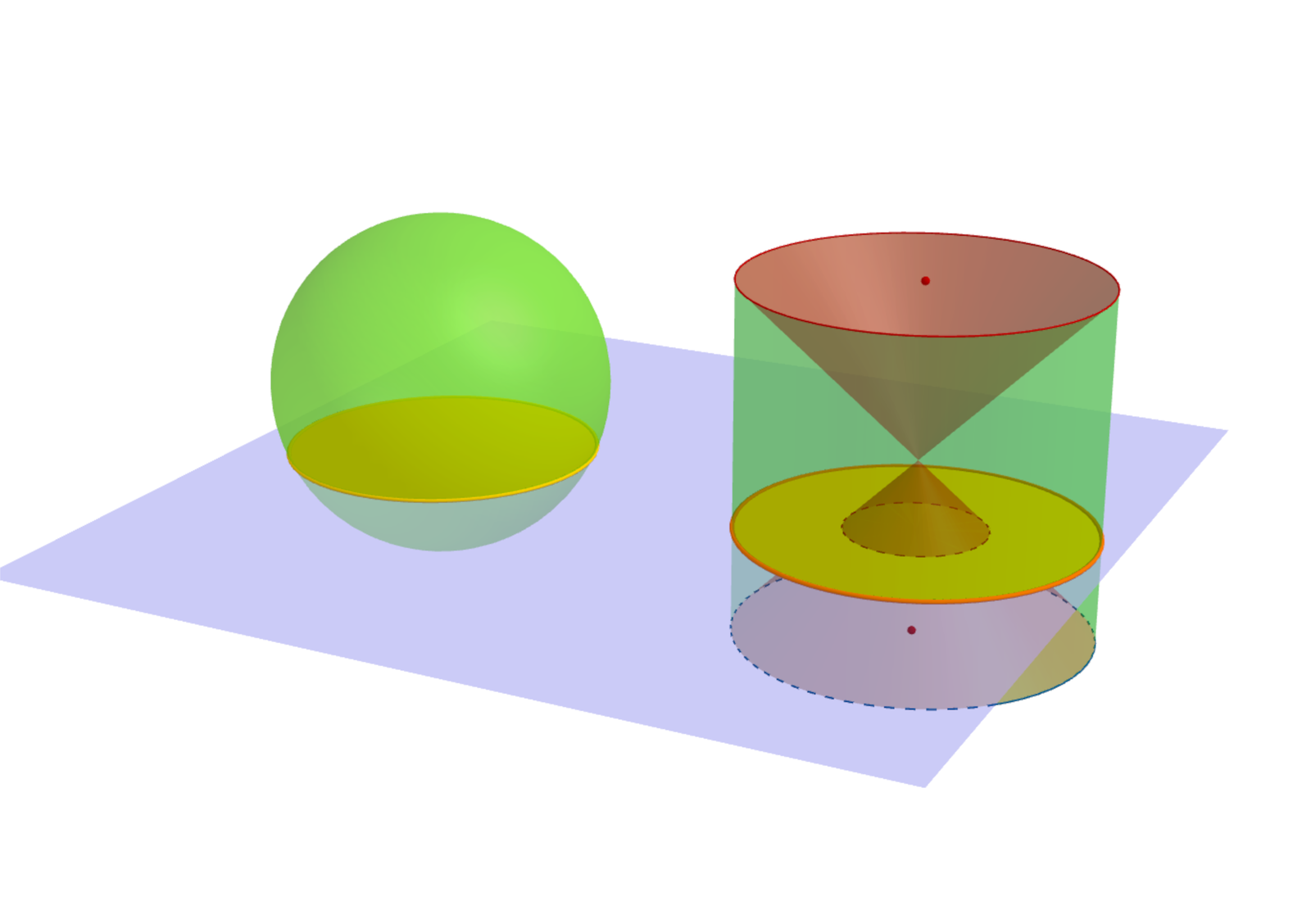 Na podstawie rozważań Cavalieriego można wywnioskować, że objętość półkuli o promieniu jest równa różnicy objętości walca o promieniu podstawy oraz wysokości i objętości stożka o promieniu podstawy i wysokości .