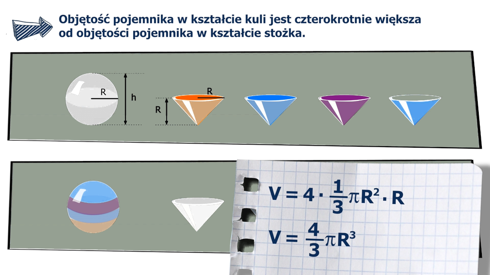 Animacja przedstawia i uzasadnia wzór na objętość kuli o promieniu R.