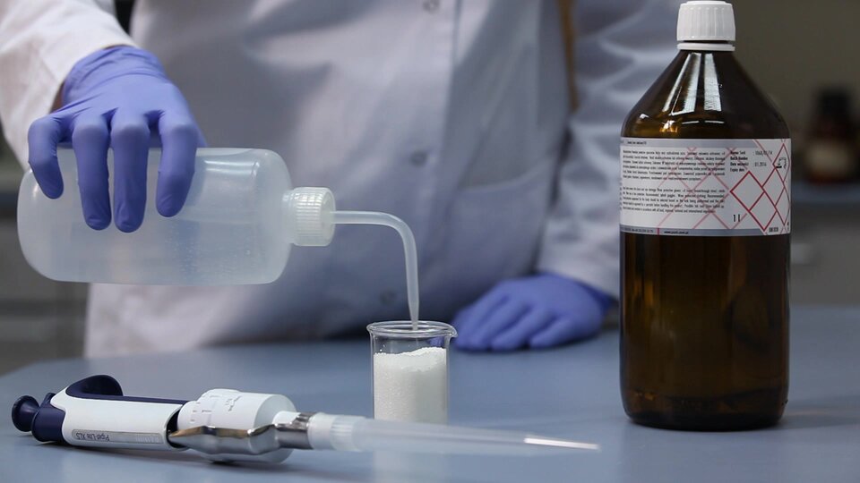 Pierwsze zdjęcie w galerii. Na ilustracji zaprezentowana jest szklana butelka z etykietką i napisem stojąca na niebieskim podłożu. Po jej prawej stronie na blacie laboratoryjnym stoją w szeregu dwa szkiełka zegarkowe, na których położono kolejno kawałek tkaniny i skrawek papieru.