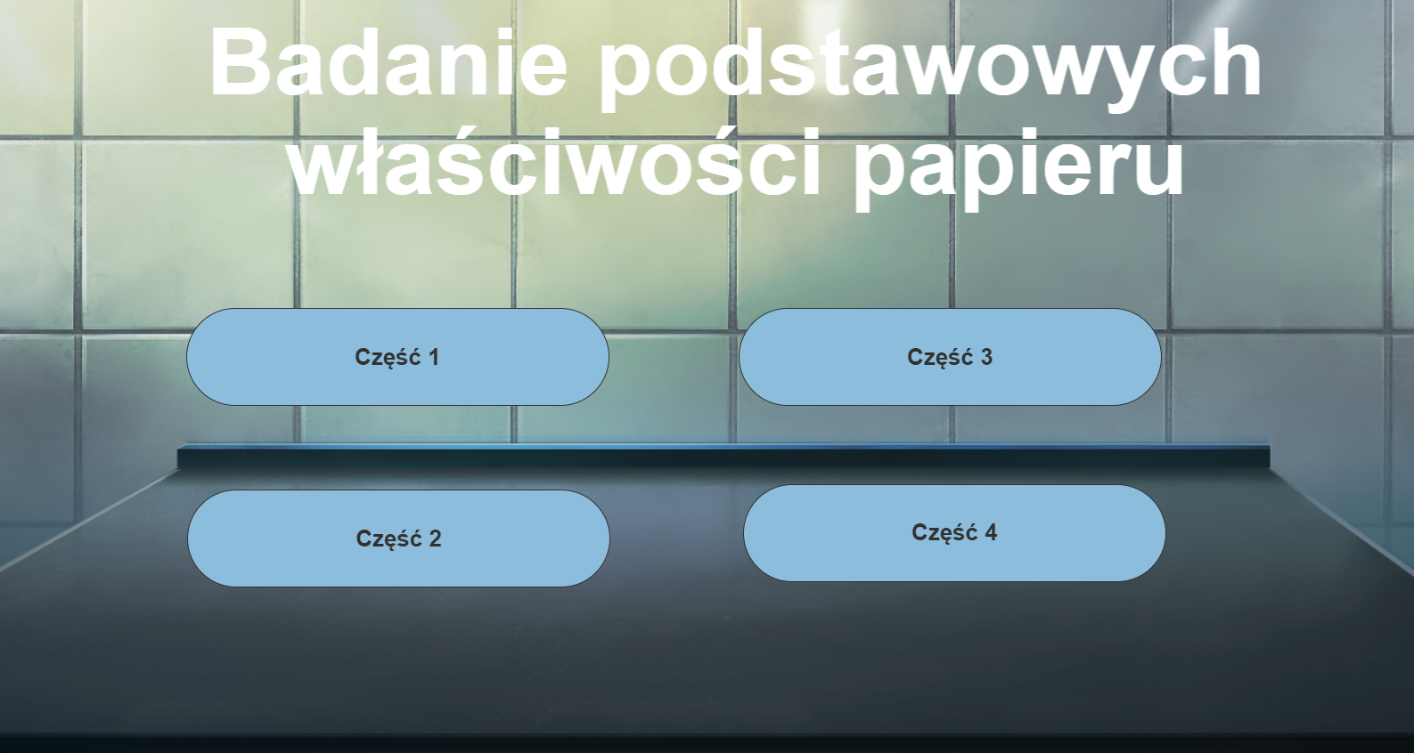 Po kliknięciu pojawia się kolejna plansza z napisem: Badanie podstawowych właściwości papieru oraz pięcioma przyciskami: część pierwsza, część druga, część trzecia, część czwarta, część piąta. Po kliknięciu przycisku wyświetla się kolejna plansza z przyciskami oznaczającymi badania laboratoryjne. W każdej części można wykonać kilka badań.