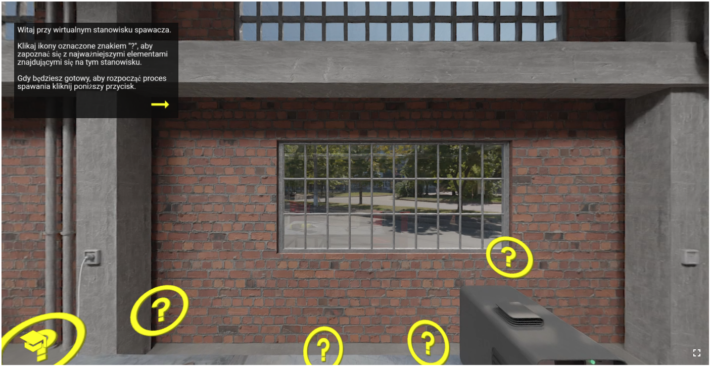 Uczeń znajduje się w trybie pierwszoosobowym. Na stoliku znajdują się różne narzędzia, o których można dowiedzieć się więcej klikając na pytajnik w żółtym kółku, wyświetlanym nad każdym elementem. Tryb ten dostępny jest przed przystąpieniem do procesu spajania.
