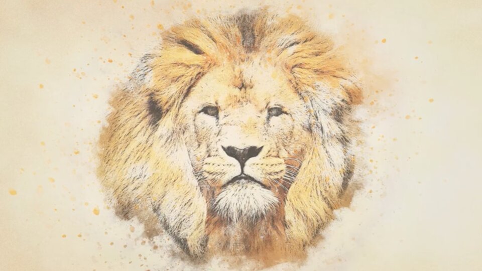 Kolorowa grafika przedstawia głowę lwa okoloną płową grzywą. Zwierzę ma zadarty ku górze pysk i przymknięte oczy. Tło jest jasne.