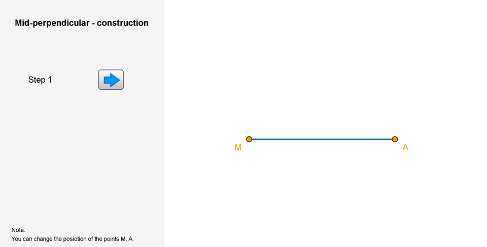 Open the aplet and observe step by step the constructionconstruction of the perpendicularperpendicular bisectorbisector of the line segmentline segment.