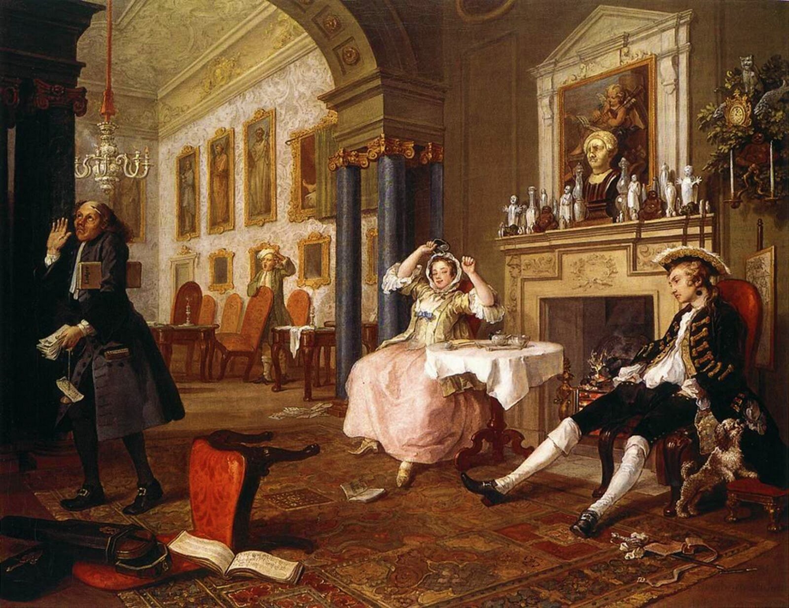 Dziewczyna przeciąga się przy stoliku nakrytym dla jednej tylko osoby, natomiast pijany jeszcze, znudzony, świeży (o ironio!) małżonek siedzi w ubraniu, którego nie zdążył jeszcze zdjąć od poprzedniego wieczoru. Bezsilność nie pozwala mu nawet zdjąć z głowy kapelusza, mimo iż odrzucił na podłogę, ujmując sobie tym samym ciężaru, szpadę. Broń jest złamana- czyżby musiał jej w nocy używać? Wesoły francuski piesek wyciąga z kieszeni pana część damskiej garderoby, a na szyi lorda widoczny jest czarny wrzód- symptom syfilisu. Symbole te można łatwo ze sobą połączyć.