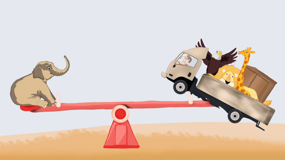 Animacja przedstawia porównanie masy słonia do masy innych zwierząt.