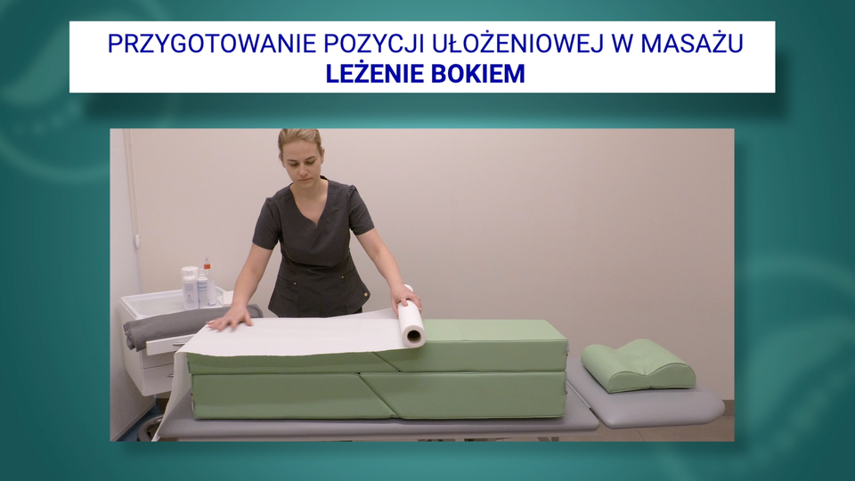 Film przedstawiający przygotowanie pozycji ułożeniowej w masażu - leżenie bokiem.