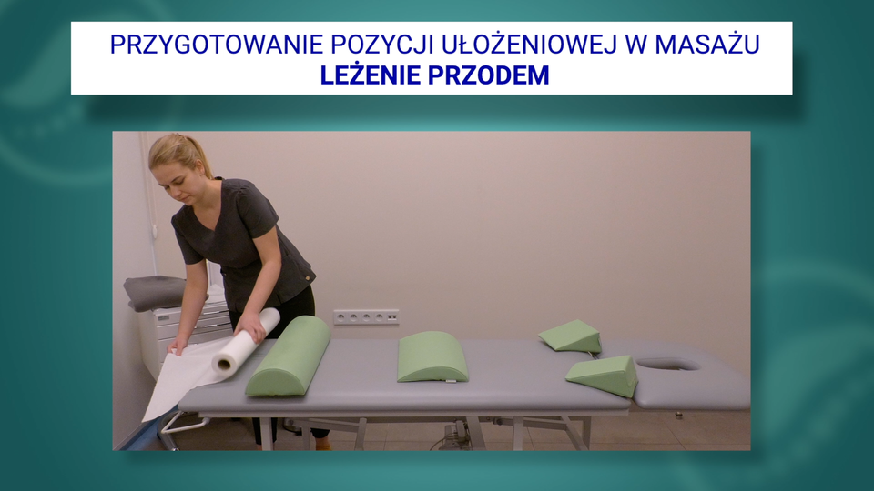 Film przedstawiający przygotowanie pozycji ułożeniowej w masażu - leżenie przodem.