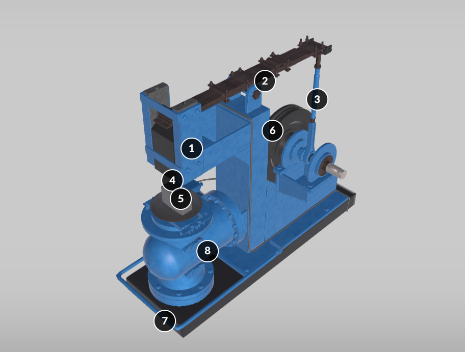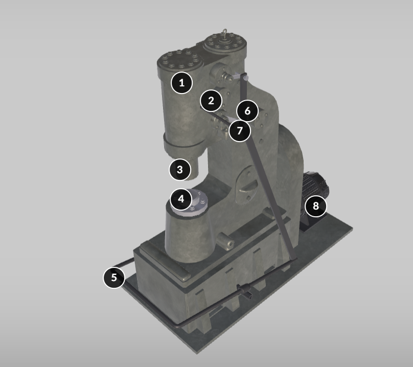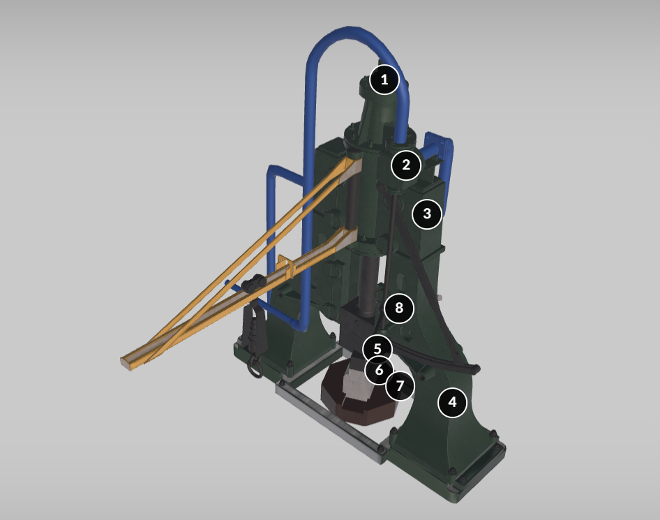 Oprócz numeru pierwszego, pod którym kryje się właśnie młot parowo‑powietrzny, na wizualizacji trzy de jest jeszcze siedem innych numerków, po których kliknięciu pojawiają się następujące elementy: