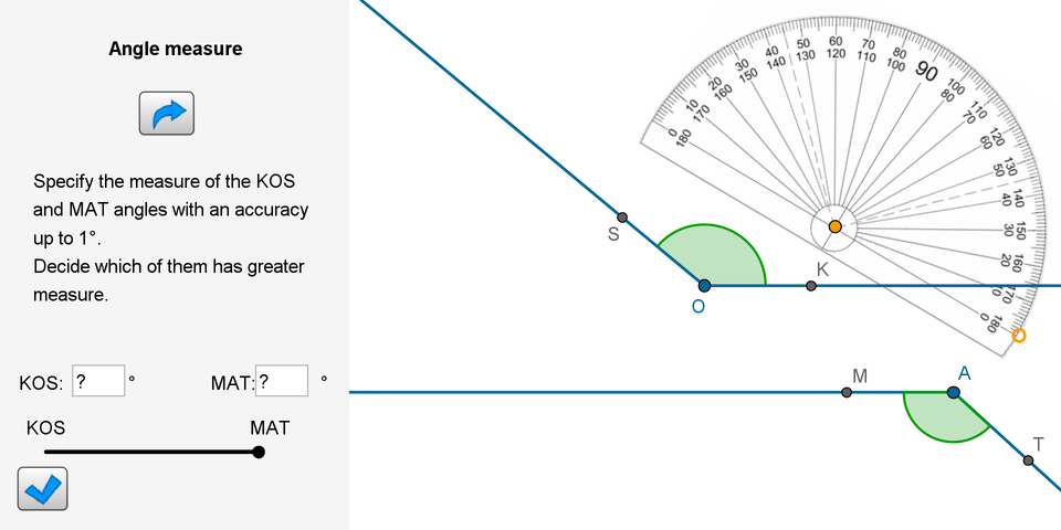 Rysunek przedstawia dwa kąty rozwarte KOS i MAT, obok kątomierz i zapis KOS: ? stopni, MAT: ? stopni.