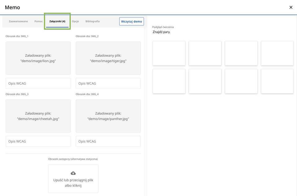 Po wstawieniu tagu image odblokuje się zakładka Załączniki, gdzie w odpowiednie pola przeciągamy ilustracje.