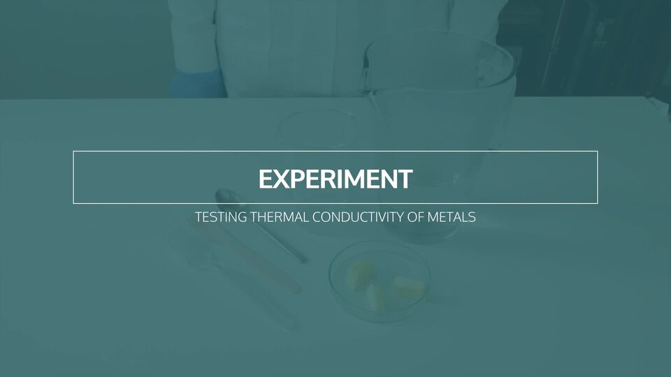Nagranie video abstraktu przedstawiające eksperyment "Badanie przewodności cieplnej metali". Do eksperymentu użyte są: szklane naczynie (beaker), gorąca woda (hot water), 3 małe kostki masła (butter), metalowa łyżka (metal spoon), drewniany widelec (wooden fork), plastikowy widelec (plastic fork). Na każdy ze sztućców naukowiec nadziewa po jednej kostce masła i wkłada do szklanego naczynia uchwytem do dołu w taki sposób że masło wystaje ponad szklane naczynie.Następnie wlewa gorącą wodę. Po kilkunastu sekundach masło na metalowej łyżce zaczyna się topić i spada.