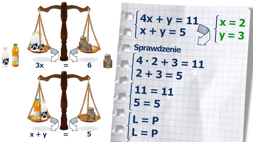Animacja przedstawia w jaki sposób możemy opisać różne przedmioty znajdujące się na wadze szalkowej w równowadze przy pomocy układów równań oraz w jaki sposób rozwiązać taki układ równań.