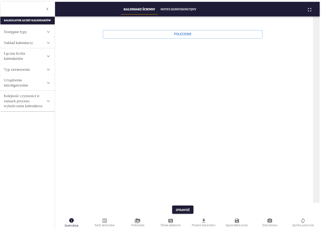 Poniżej górnej belki znajduje się przycisk „Polecenie”, po kliknięciu na który pojawia się opis kolejnych kroków do wykonania. W dolnym pasku ekranu znajdują się ikony: „Instrukcja” programu ćwiczeniowego – zawierająca wszystkie instrukcje techniczne niezbędne do korzystania z programu ćwiczeniowego; ikona „Multimedia”, pod którą znajdują się odnośniki do konkretnych materiałów multimedialnych powiązanych tematycznie z programem ćwiczeniowym; ikona “Tabele zależności”; oraz ikona „Lista kroków”, która w dowolnym momencie umożliwia zapisanie postępów pracy i pobranie pliku na komputer.