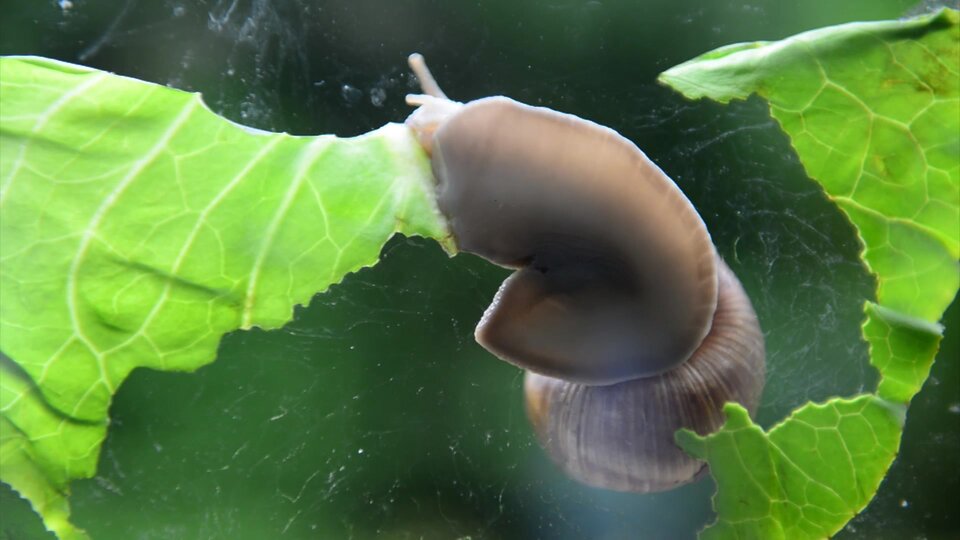 Kiedy ślimak czuje się zagrożony, wciąga głowę i nogę do muszli.