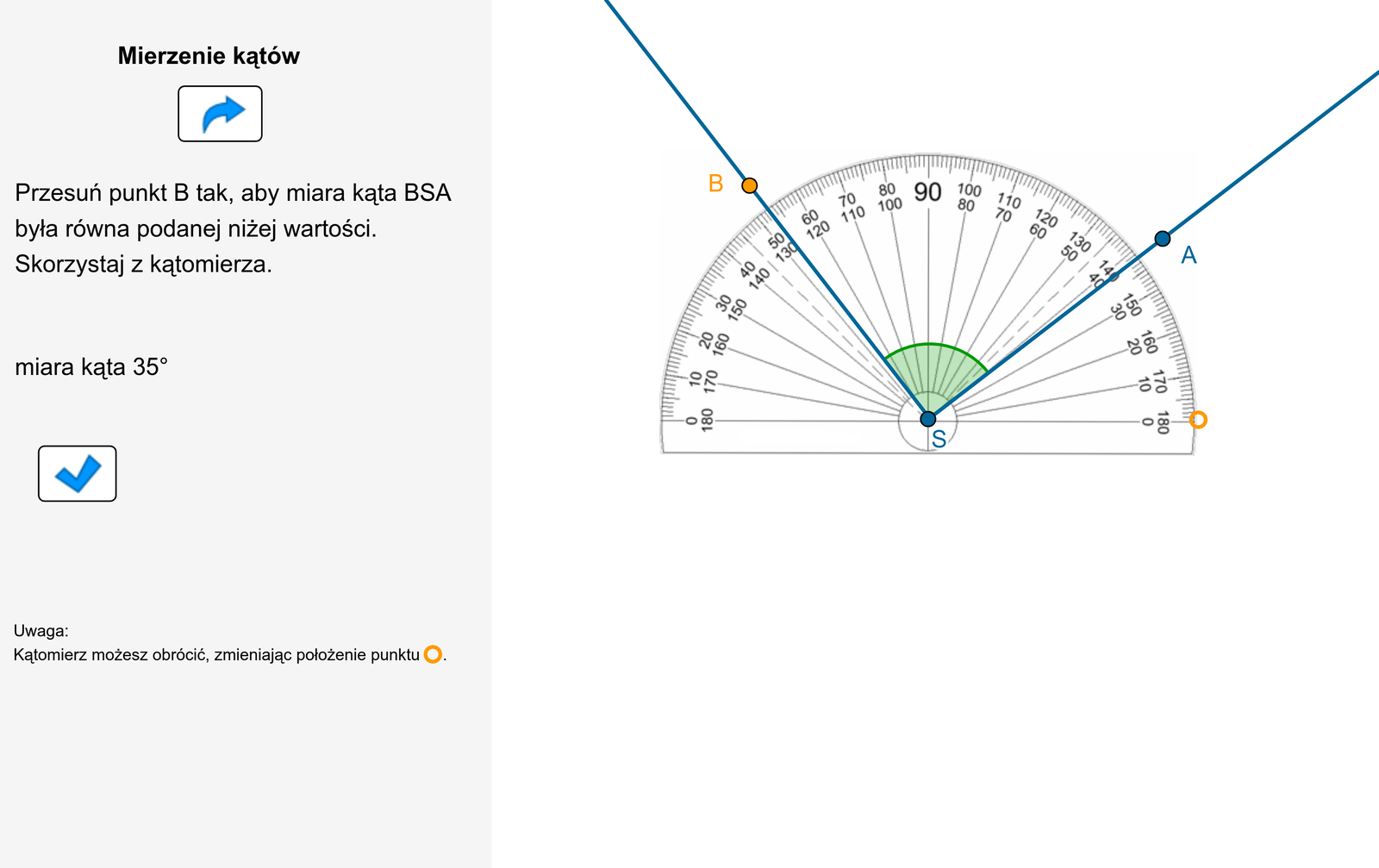 Zapoznaj się z poniższym apletem dotyczącym mierzenia kątów za pomocą kątomierza i wykonaj polecenia w nim zawarte.