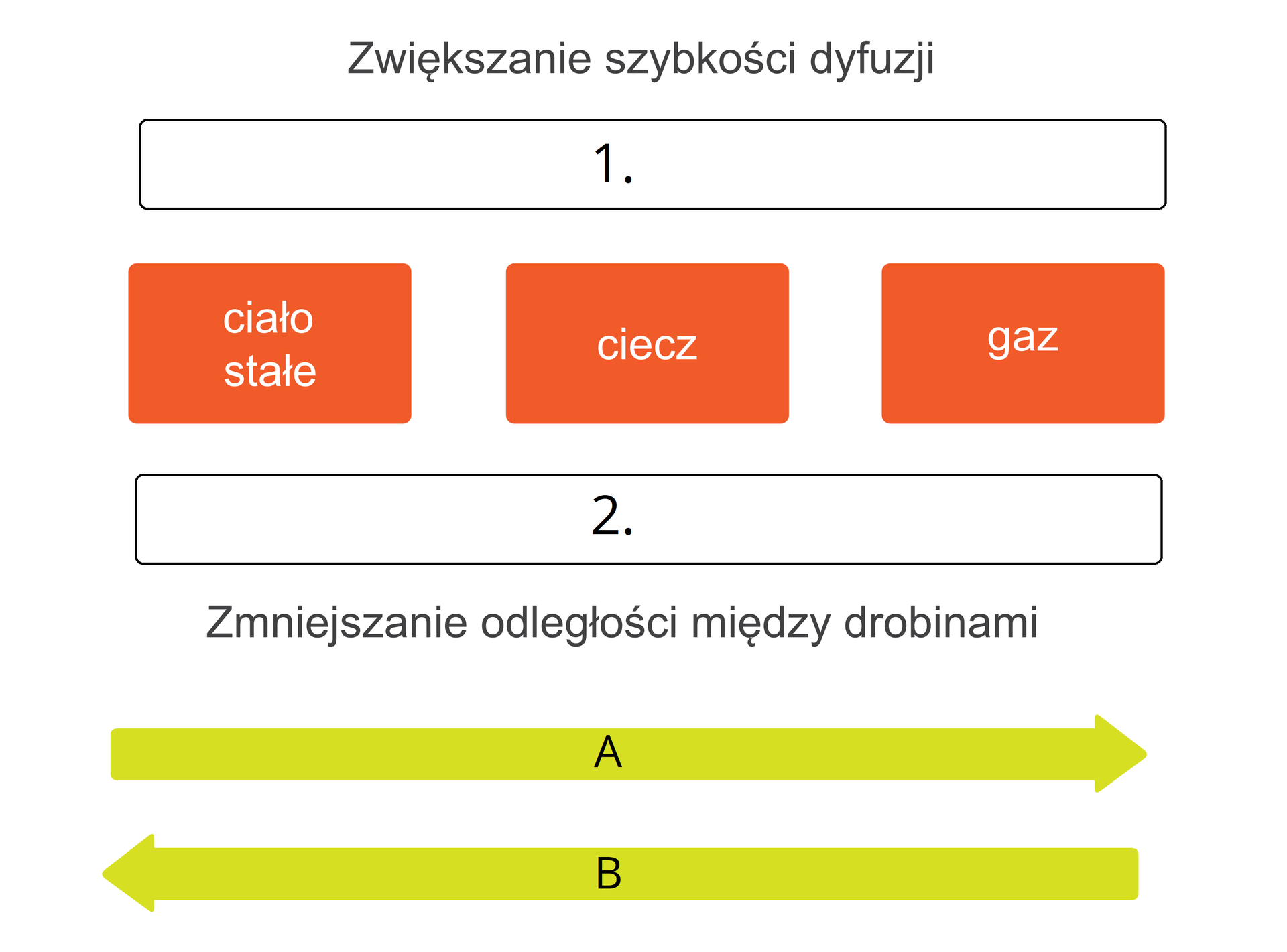 Dopasuj oznaczenie strzałek z oznaczeniami pustych pól tak, aby schemat przedstawiał zależność szybkości dyfuzji od stanu skupienia mieszaniny.