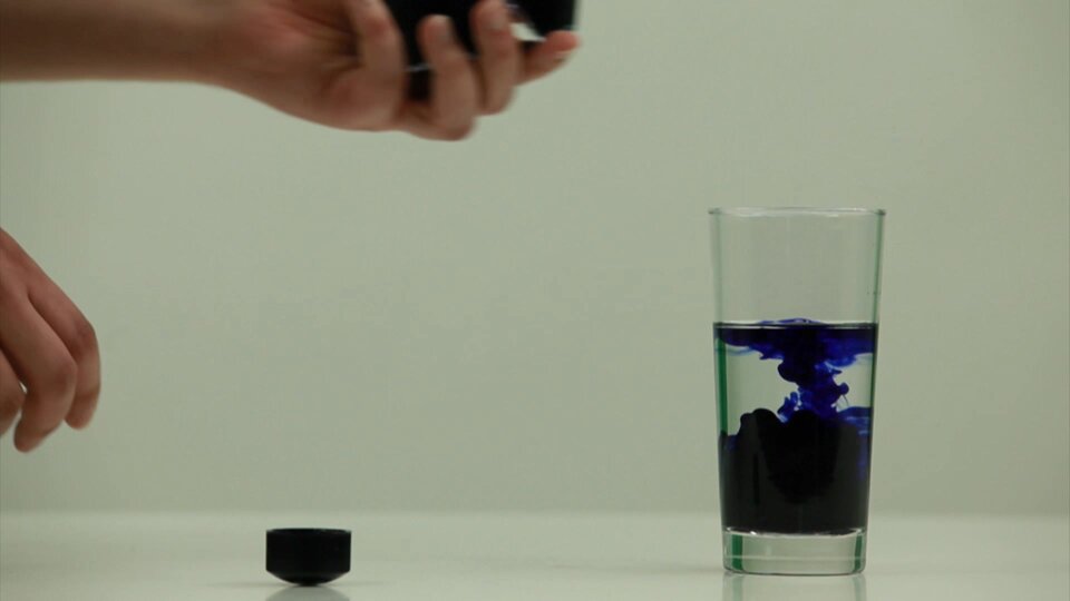 Po dodaniu atramentu do wody powstają smugi, a po chwili zawartość zlewki zabarwia się na niebiesko.