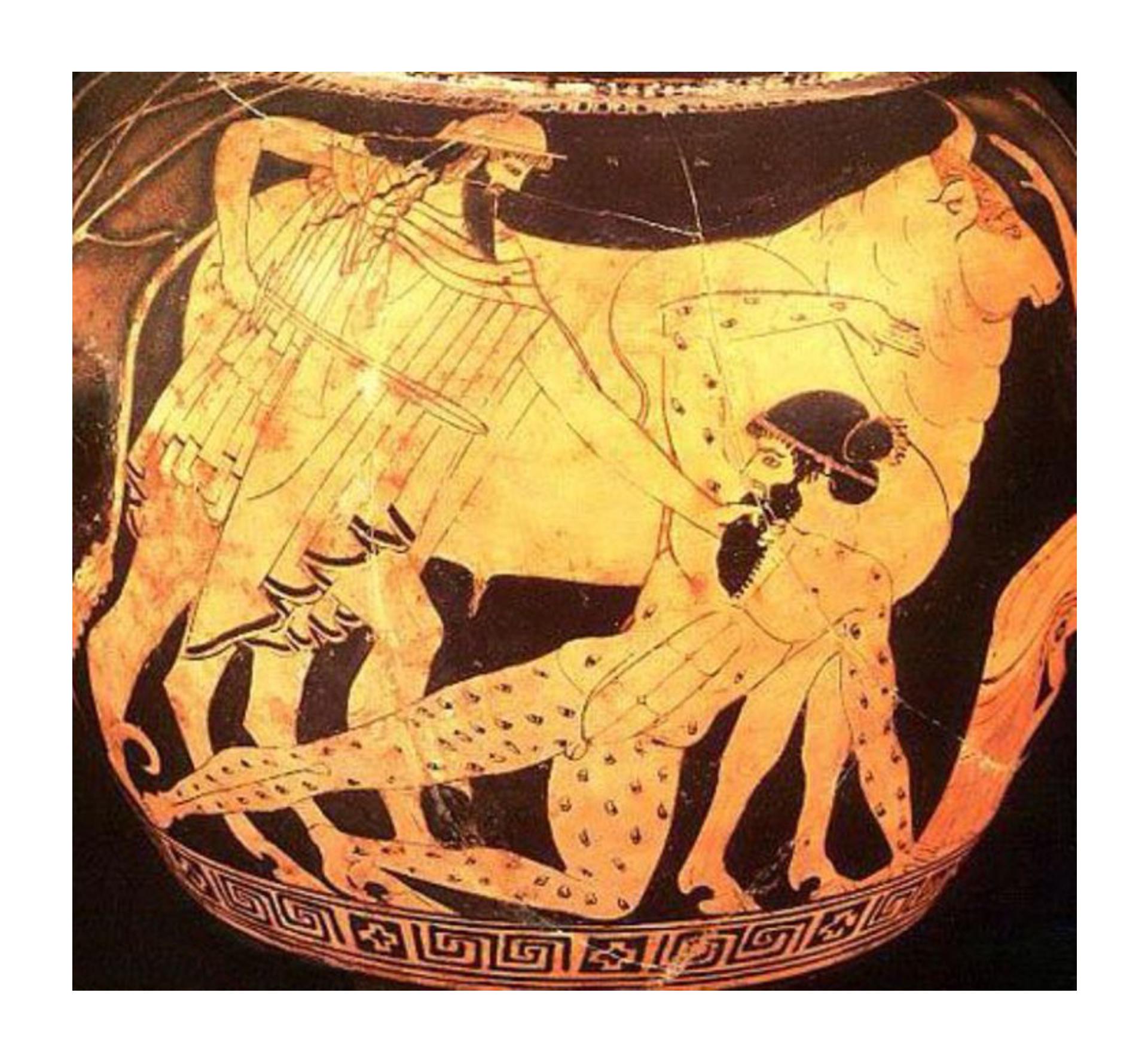 Ilustracja przedstawia starożytne naczynie. Zdobi je rysunek, na którym widać postacie w starożytnych szatach, ustawionych w rzędzie. W centrum rysunku umieszczono dwóch walczących ze sobą mężczyzn. Oprócz nich widać również dwie kobiety, mężczyznę i cielę.