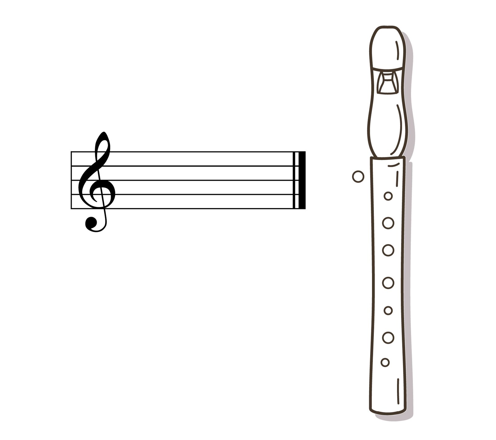 Grafika przedstawia pięciolinię, podpisaną g’ (z apostrofem) po lewej stronie oraz czarno‑biały flet prosty w układzie pionowym po prawej stronie.
